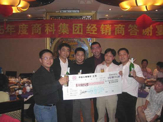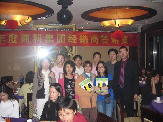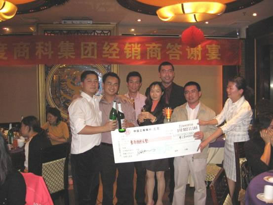 2006年1月17日,商科集團(tuán)廣州分公司與100多位經(jīng)銷(xiāo)商濟(jì)濟(jì)一堂,舉行了經(jīng)銷(xiāo)商答謝宴,感謝過(guò)去一年各位經(jīng)銷(xiāo)商對(duì)商科集團(tuán)的支持,當(dāng)晚還頒發(fā)了“年度個(gè)人貢獻(xiàn)獎(jiǎng)”,“年度公司貢獻(xiàn)獎(jiǎng)”,“年度優(yōu)秀代理商獎(jiǎng)”,獎(jiǎng)品和獎(jiǎng)金豐厚,氣氛熱烈,讓我們一起看看當(dāng)晚的盛況。