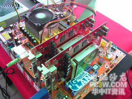 基于SM3.0、HDR以及SLI這三大顯示技術的GF6系顯卡產品擺滿了整個產品展示區的展臺。從入門級的6200TC直到最近被各大IT媒體所熱炒的6800GS,展示產品可以說是琳瑯滿目。