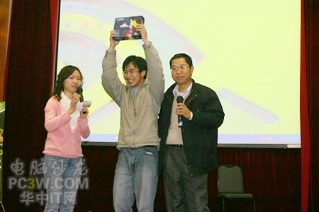 今天的第一個大獎馬上就要被抽出了,獎品為商科集團武漢天行電腦提供的臺電MP3一個。看到這個精美的MP3同學們都興奮起來了! 第一位中獎的是位漂亮MM,這位中獎的MM很大方,在觀眾的要求下為大家獻上了一首范曉萱的歌,并邀請了臺下一位GG伴舞,看來華師GGMM們多才多藝可不是吹出來的哦!