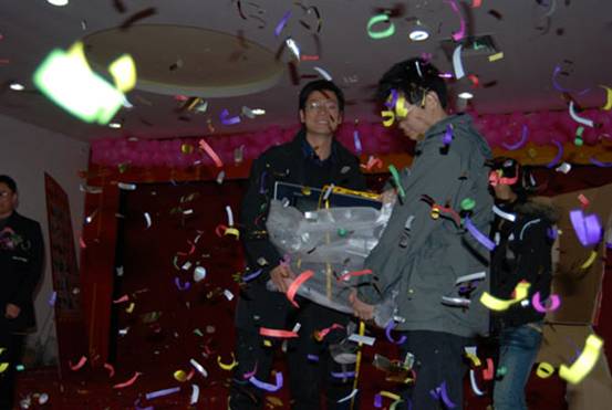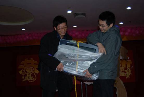 在抽獎晚會的最后,工作人員特別準備了一份神秘的獎品,有全體與會人員共同參與。這份神秘的禮物是什么呢?到底會花落誰家呢?在同事的驚喜聲中,來自臺電數碼事業部的一位同事贏得這個神秘的全場特別大獎。