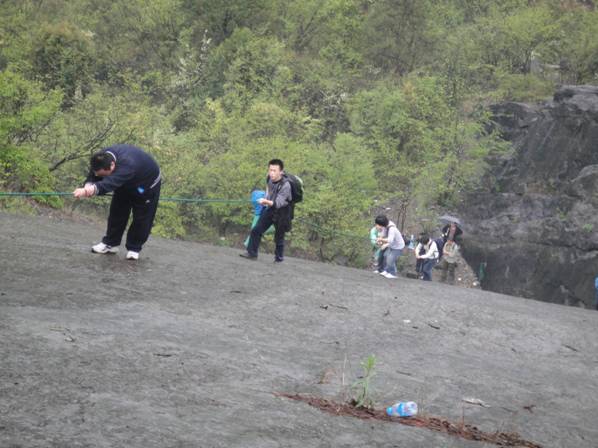 這是紀龍山有名的豹子崖,坡度有60多度,高3、40米,天上的雨稀里嘩啦,陡峭的崖壁顯得異常險滑。教練建議我們不爬的跟著助教走另外一條路,但我們整個團隊50人, 沒有一個放棄的,大家互幫互助的全部爬上了豹子崖!