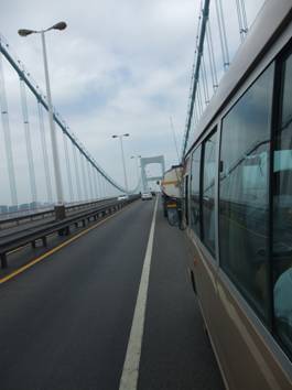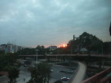 經過整整九個多小時的長途跋涉,下午六點多,終于即將到達我們的第一站,在進入市區的時候恰巧夕陽西下,一輪紅日慢慢隱沒與橋的那一頭,又一副壯美景觀呈現于眼前。。