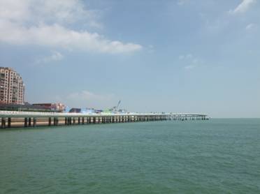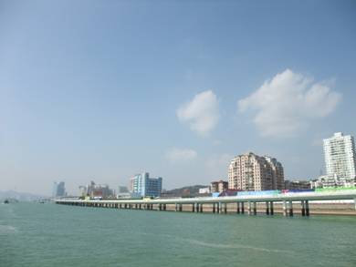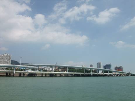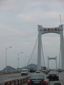 從導游宋小姐口中得知,海滄大橋乃是世界第二,亞洲第一的特大型三跨全漂浮鋼箱梁懸索橋,全長五千多米(嘿嘿,當時沒記住詳細數據,查資料得知全長5926.527米,主跨648米);大橋的索塔采用門式結構,橋柱各部結構采用曲線造型為基調的設計構思,型體上線條流暢,輕柔,使大橋本身也為了一座藝術精品。 遠遠望去,銀藍色的橋體與碧藍色的天空相輝映,似長虹如玉帶般橫臥在粼粼的海面上。一條條平行鋼絲索股,掛在門式索塔上,舉目望去行駛的汽車仿佛飛翔在藍天碧海中,縱橫交錯,真是美不勝收的畫卷。