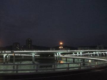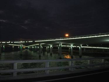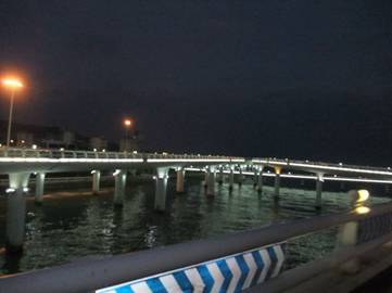 當旅行巴士進入市區行至環島路西段時,一座壯美獨特的大橋又躍然于眼前。此時,正值華燈初上,遠遠看去只見一長排橋墩呈橢圓型立于水中,空中橋身則為流暢的弧線形,橋上燈火輝煌,橋下波光蕩漾,就如同一條騰出水面的白龍,強烈地震撼著我們的視覺,原來這就是著名的“演武大橋”。