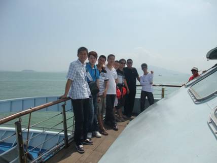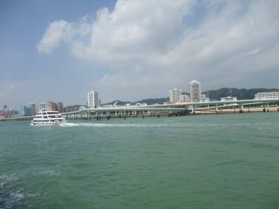 金門島游輪合影 次日,乘坐游輪環游小金門島再次經過演武大橋,立于船頭遙望廈門市區,只見大橋迎面聳立海上,與夜景絕然不同,她與岸同高, 呈S形的路段環繞著廈門大學的海景房,流線型的梁體緩緩延伸,波浪似地起伏著;遠遠看去,如長龍臥波,欲騰空而起,細看時 又似展翅飛翔的白鷺,躍出水面的白鰭豚,簡捷流暢的線條,精美靈動的造型,給人以強烈的視覺美感。