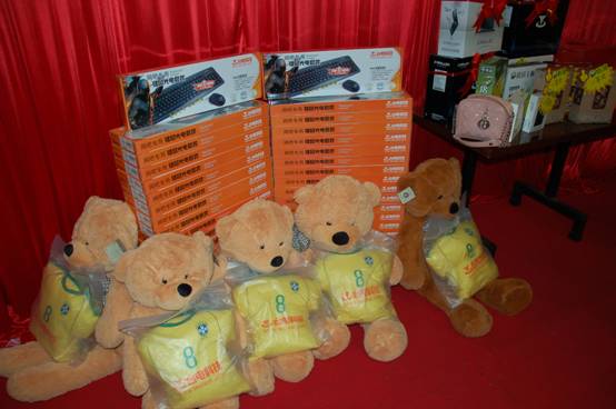 本次晚宴除開幾個大獎以外,也特意為到場的每一位經銷商朋友準備了鼓勵獎,獎品分別為臺電U盤。攝像頭。鍵鼠套裝。電影票。抱抱熊等等,作為禮物送給了所有朋友。。
