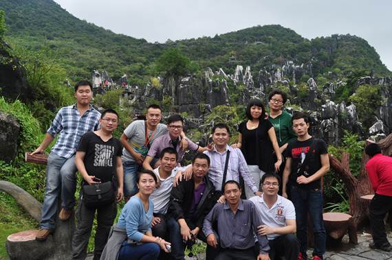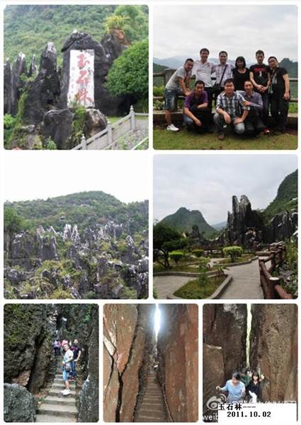 當(dāng)天下午三點(diǎn)多我們又來到玉石林景區(qū),它之所以叫玉石林是因?yàn)樯缴系氖^屬于玉白色,不同于昆明的花崗巖石林;一路行去,處處石林矗立、石芽裸露、奇峰突兀、石筍石柱狹縫密布;玉石林的小路涉及很科學(xué),在不大的景區(qū)蜿蜒穿插,交錯(cuò)疊行,可以使游人充分運(yùn)動(dòng),又能從不同角度去欣賞玉石林的特色;大家逢路必走,有坡必上,特別是在“一線天”,累的大汗淋漓,較上午的游姑婆山累多了。。。