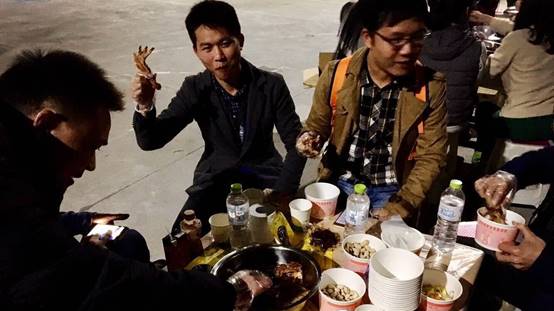大家走了半天,終于到了午飯時間了,好菜可多啦,大家圍坐在一起,吃這頓豐盛的中午飯,有說有笑。
