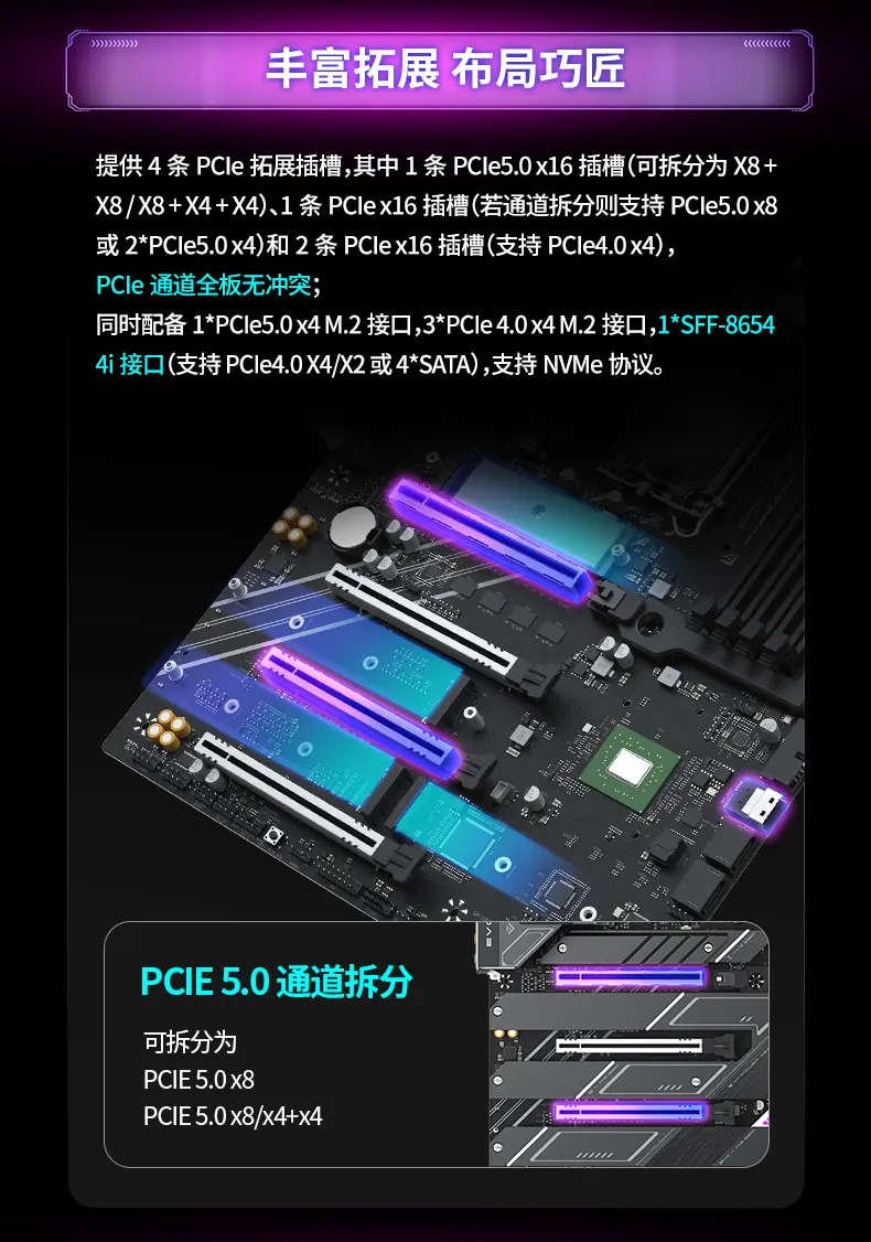 拓展方面,MS-iCraft Z890 Pacific提供前后置三Type-C,其中2個后置Type-C接口達到40G理論傳輸速度,數據傳輸速度進一步升級!拓展方面,該主板提供4條PCIe拓展插槽,其中1條PCIe5.0 x16插槽可拆分為X8+X8/X8+X4+X4,PCIe通道全板無沖突,配備4個M.2硬盤接口和1個SFF-8654 4i接口(支持PCIe4.0 X4/X2或4*SATA)。