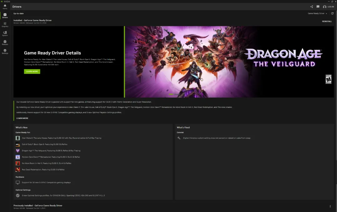 在驅動程序頁面上,NVIDIA App 進行了優化,以要點形式清晰突出新增和改進內容,以及支持的游戲列表,方便用戶瀏覽。想要切換 Studio Ready 驅動或 Game Ready 驅動的用戶只需點擊屏幕右上角的下拉菜單即可。
