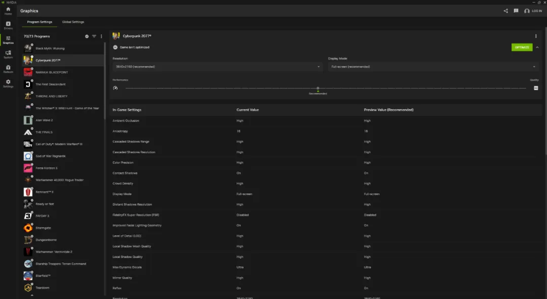 對于游戲玩家來說,圖形設置十分重要。現在通過NVIDIA App,用戶只需點擊“優化”按鈕,即可自動配置游戲的所有設置,并啟用包括 DLSS 和 Reflex 在內的 NVIDIA 技術,還可以通過 NVIDIA 控制面板中的“管理 3D 設置”進一步配置游戲和應用,以全局或針對某個游戲啟用和覆蓋驅動功能。NVIDIA app 將所有這些選項集成在一個易于訪問、響應迅速的“圖形”選項卡中。