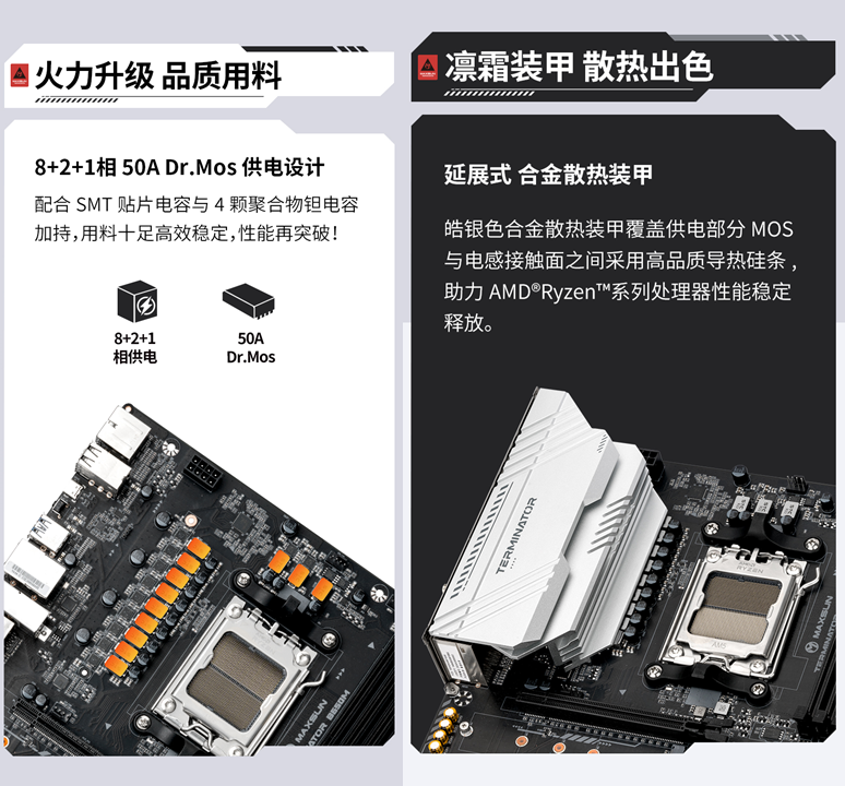 強(qiáng)悍性能的背后,是十足的用料。銘瑄Terminator B650M WIFI6主板采用8+2+1相 50A Dr.Mos 供電設(shè)計(jì),配合高品質(zhì)的SMT貼片電容與聚合物鉭電容,能夠?yàn)锳MD 銳龍?zhí)幚砥魈峁┓(wěn)定且強(qiáng)勁的電力支持。散熱方面更是誠(chéng)意滿滿,皓銀色合金散熱裝甲覆蓋供電部分MOS與電感接觸面之間采用高品質(zhì)導(dǎo)熱硅條,如同給核心部件穿上 “降溫鎧甲”,助力AMD銳龍?zhí)幚砥餍阅芊(wěn)定,為用戶提供可靠的使用體驗(yàn)。
