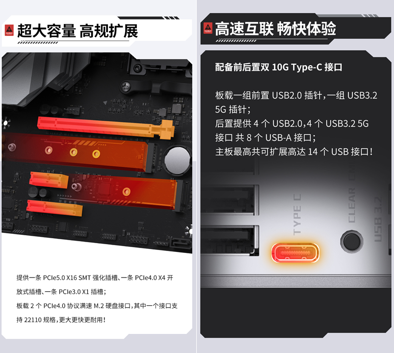 擴(kuò)展能力方面,更是做到了 “全場(chǎng)景覆蓋”, 讓拓展需求無(wú)需妥協(xié)。該主板提供一條PCle5.0 X16 SMT強(qiáng)化插槽、一條PCle4.0 X4開(kāi)放式插槽、一條PCle3.0X1插槽;板載2個(gè)PCle4.0協(xié)議滿速M(fèi).2硬盤接口,其中一個(gè)接口支持 22110 規(guī)格,更大更快更耐用。且接口十分豐富,擁有前后置雙10G 速率Type-C接口,可擴(kuò)展高達(dá)14個(gè)USB接口,大大提高了擴(kuò)展能力,無(wú)論是連接高速外設(shè)、多屏顯示還是充電需求,都能輕松應(yīng)對(duì),全板無(wú)沖突設(shè)計(jì)讓拓展更隨心所欲。
