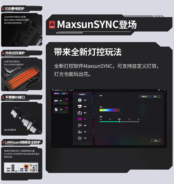 除此之外,貼心設(shè)計(jì)讓裝機(jī)與使用更省心。主板內(nèi)置了Debug自檢燈,遇到故障一鍵排查;一鍵重置CMOS按鍵,哪怕是新手裝機(jī),遇到問(wèn)題也能快速排查,裝機(jī)過(guò)程更順暢;全新燈控軟件 MAXSUN SYNC 更是顏值加分項(xiàng),支持多種自定義燈效模式,打造專屬電競(jìng)氛圍,讓主機(jī)不僅是性能利器,更是桌面顏值擔(dān)當(dāng)。