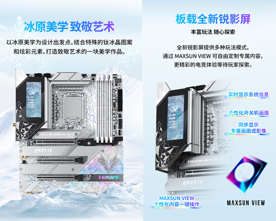 首先是銘瑄 iCraft Z890 Arctic主板,作為iCraft系列的高端型號(hào),以 “北冰洋” 為設(shè)計(jì)靈感,采用冰原美學(xué)設(shè)計(jì)。特殊的鈦冰晶圖案搭配炫彩元素,整體色調(diào)統(tǒng)一且富有質(zhì)感,擺在機(jī)箱中宛如一件冰雕藝術(shù)品,完美適配當(dāng)下流行的白色主機(jī)風(fēng)格,與《戰(zhàn)地 6》的冰雪戰(zhàn)場(chǎng)形成奇妙呼應(yīng)。板載的全新銳影LED屏,不僅支持RGB光效同步,還能實(shí)時(shí)顯示CPU溫度、內(nèi)存頻率、供電狀態(tài)等核心參數(shù),更有多種玩法模式可選。這讓你在激戰(zhàn)《戰(zhàn)地 6》時(shí),無(wú)需頻繁切換監(jiān)控軟件打斷游戲,就能直觀掌握硬件運(yùn)行情況,實(shí)用性與觀賞性拉滿。