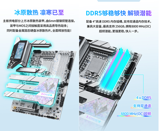 性能方面,這款主板采用16+1+1 相 DR.MOS 供電搭配 8 層服務(wù)器級(jí) PCB,實(shí)現(xiàn)高性能與低損耗的完美平衡,能充分釋放酷睿Ultra 200S系列處理器的性能。散熱設(shè)計(jì)同樣拉滿,供電部分上方的冰原散熱裝甲由6mm鍍鎳銅管連接,裝甲與MOS之間的接觸面采用高品質(zhì)導(dǎo)熱硅條;同時(shí)配備金屬固態(tài)硬盤(pán)冰原散熱片,全面保障硬件冷靜運(yùn)行,性能持續(xù)在線不 “掉鏈”。內(nèi)存與擴(kuò)展能力也十分出色。它配備4條高速DDR5內(nèi)存插槽,支持雙通道內(nèi)存技術(shù),最高支持256GB容量,還擁有8800MHz (OC)超頻潛能,搭配CUDIMM內(nèi)存可輕松突破頻率上限,讓《戰(zhàn)地6》的游戲紋理加載速度大幅提升,進(jìn)入戰(zhàn)場(chǎng)更快一步。