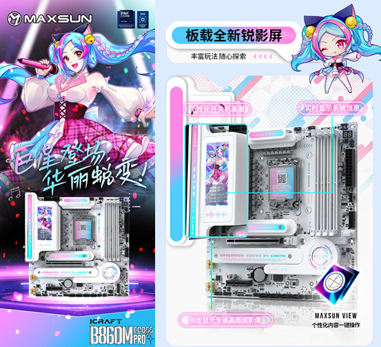然后是銘瑄iCraft B860M CROSS PRO主板,作為顏值旗艦,全覆蓋著藍(lán)粉漸變的二次元紋路,每一處細(xì)節(jié)都透著精致感。吸睛亮點(diǎn)莫過(guò)于全新配備的3.4英寸銳影LED顯示屏,不僅能實(shí)時(shí)顯示CPU溫度、內(nèi)存頻率等系統(tǒng)信息,還能自定義開(kāi)關(guān)機(jī)畫(huà)面,甚至支持桌面映射,同步展示專屬壁紙或游戲畫(huà)面。搭配配套軟件MAXSUN View,玩家可以盡情解鎖無(wú)限自定義玩法,讓主板成為主機(jī)的 “個(gè)性門(mén)面”。