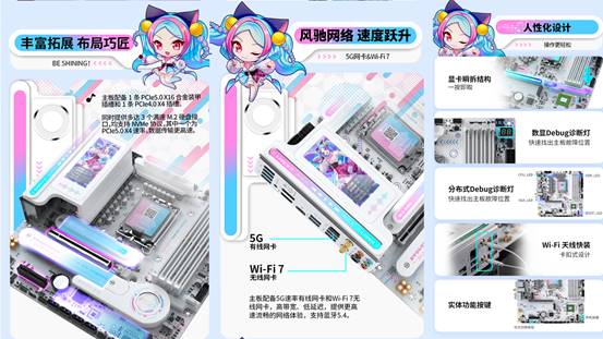拓展性與網(wǎng)絡(luò)體驗(yàn)更是直擊玩家需求。該1條PCIe5.0 X16合金裝甲插槽+1條 PCIe4.0 X4 插槽,搭配3個(gè)滿速M(fèi).2硬盤(pán)接口和 4個(gè)6G SATA接口,無(wú)論是加裝高速固態(tài)硬盤(pán)還是拓展其他硬件,都能從容應(yīng)對(duì)。多人對(duì)戰(zhàn)時(shí)就怕網(wǎng)絡(luò)卡頓,這款主板搭載英特爾BE200無(wú)線網(wǎng)卡,支持Wi-Fi 7 和藍(lán)牙5.4,再加上5G有線網(wǎng)口的雙旗艦網(wǎng)絡(luò)配置,傳輸速度又快又穩(wěn),讓你在《戰(zhàn)地6》的百人對(duì)戰(zhàn)中告別延遲,快速響應(yīng)每一次戰(zhàn)術(shù)指令。更貼心的是,顯卡瞬拆結(jié)構(gòu)和 Wi-Fi天線快裝設(shè)計(jì)讓裝機(jī)、升級(jí)更便捷,數(shù)顯+分布式 Debug 診斷燈能一眼識(shí)別故障位置,省去繁瑣排查步驟,讓玩家專注享受裝機(jī)與游戲的樂(lè)趣。
