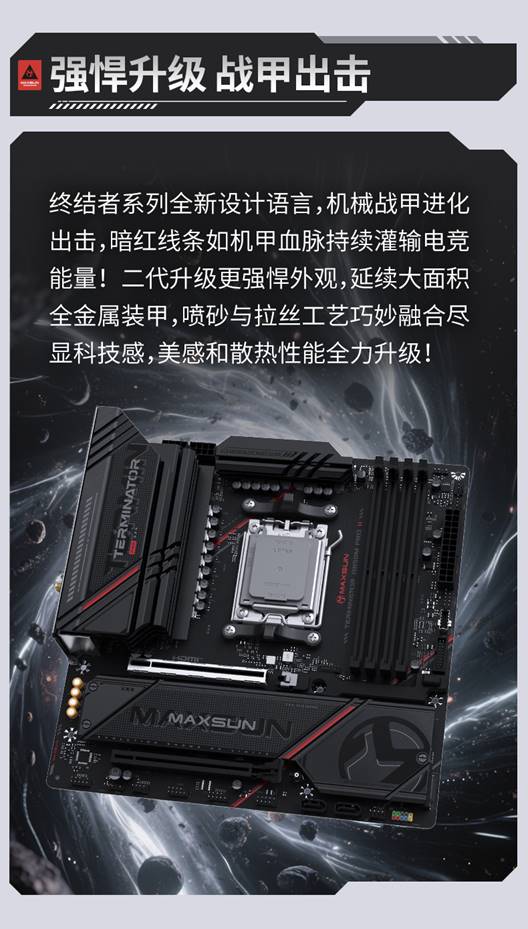 終結者系列全新設計語言再度突破,機械戰甲外觀進化出擊,二代升級更強悍外觀,暗紅線條如機甲能量脈絡貫穿散熱裝甲,大面積全金屬裝甲,噴砂與拉絲工藝巧妙融合,進一步提升視覺科技感與整體質感。