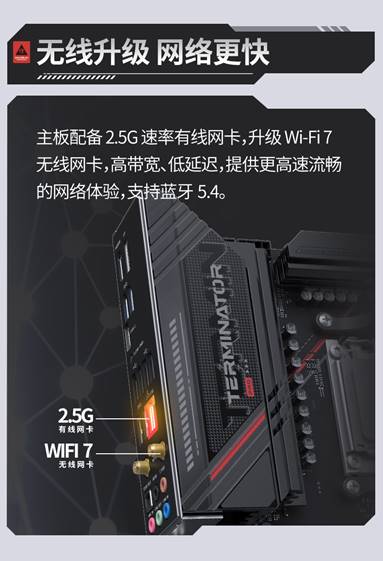 網絡方面,主板升級到WiFi 7無線網卡,支持藍牙5.4,有線方面則配備 Realtek RTL8125D 2.5G 高速網卡。無論是有線還是無線,都能提供高帶寬、低延遲的網絡環境,為在線學習、高清直播、高速下載和競技游戲帶來流暢穩定的連接體驗。
