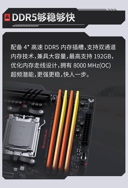 內存方面,主板提供4*高速DDR5內存插槽,擁有8000MHz(OC)超頻潛能,顯著提升響應速度,讓你在學習和娛樂中快人一步。無論是多任務處理,還是進行數據密集型操作,都能感受到內存性能提升帶來的便捷體驗。