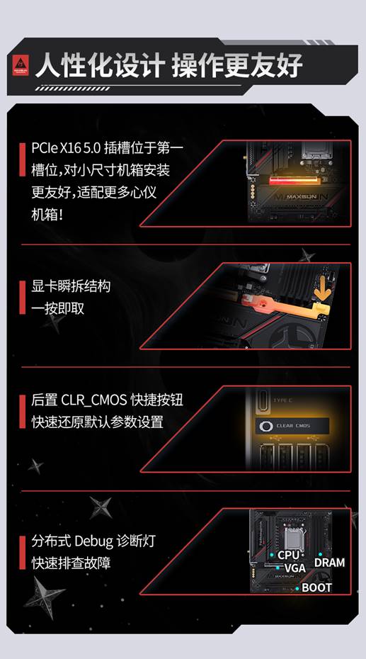 許多在一代產品上備受好評的貼心設計也延續到了MS-Terminator B850M PRO II WIFI7,如顯卡瞬拆結構、分布式Debug診斷燈和CLR_CMOS快捷按鈕,讓用戶能有更便捷省心的裝機體驗。
