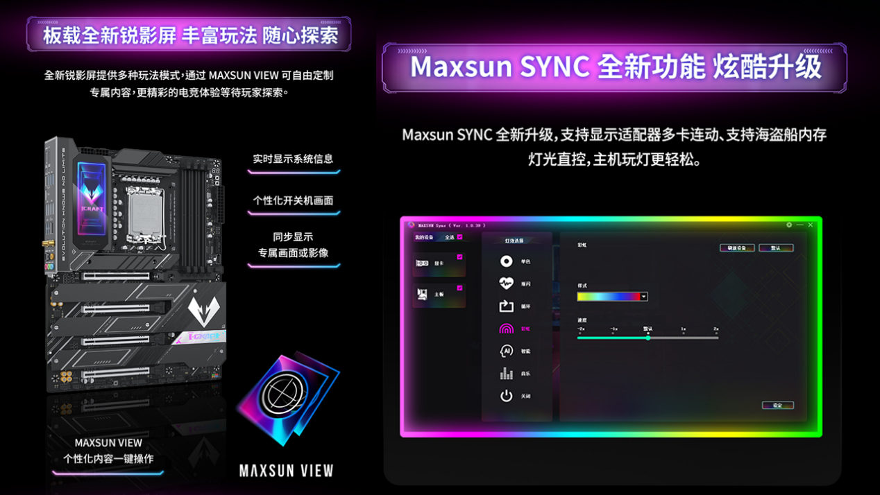 在功能設計上,銘瑄iCraft Z890 Pacific主板亮點滿滿。板載的全新銳影LED屏,能實時顯示CPU溫度、內存頻率、供電狀態等核心參數,更有多種玩法模式可選。激戰游戲時無需切換監控軟件,就能直觀掌握硬件運行情況,實用性拉滿。還支持RGB光效同步,可與顯卡、內存等外設實現燈光聯動,隨心切換炫酷燈光效果,無論是黑色電競主機,還是純白海景房裝機,都能完美適配,輕松打造氛圍感拉滿的裝機效果。