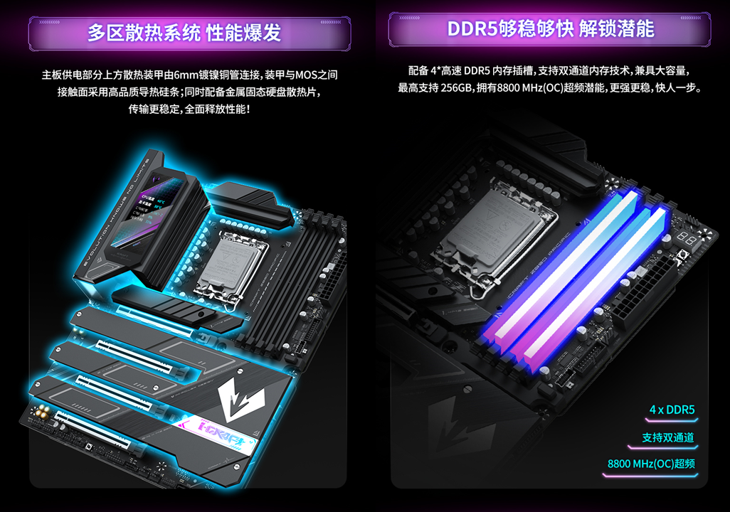 散熱設計方面這款主板同樣拉滿,供電部分上方的冰原散熱裝甲由6mm鍍鎳銅管連接,裝甲與MOS之間的接觸面采用高品質導熱硅條;同時配備金屬固態硬盤冰原散熱片,全面保障硬件冷靜運行,性能持續在線不 “掉鏈”。 內存方面,配備4條高速DDR5內存插槽,支持雙通道內存技術,最高支持256GB容量,還擁有8800MHz (OC)超頻潛能,搭配CUDIMM內存可輕松突破頻率上限,讓游戲的紋理加載速度大幅提升。