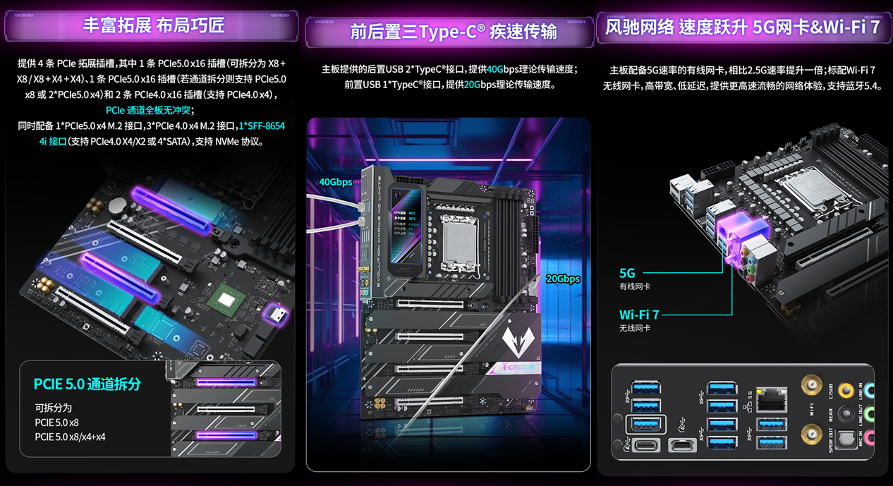 擴展方面也十分出色,該主板提供4條PCle拓展插槽,其中1條PCIe 5.0 x16插槽支持靈活拆分,可根據需求調整為X8+X8 或X8+X4+X4模式,滿足同時搭載高性能顯卡與PCIe擴展卡的需求;板載的SFF-8654 4i接口,可靈活擴展為PCIe 4.0 x4通道或4個 SATA 接口,適配多設備存儲方案。I/O區域的兩個40Gbps速率USB4 Type-C 接口,配合DP 1.4與HDMI 2.1視頻接口,輕松滿足多設備連接需求。網絡體驗同樣無需擔憂,該主板搭載 Intel BE200 無線網卡與 Realtek RTL8126 有線網卡,支持 Wi-Fi 7 與 5G 有線網絡,還具備藍牙 5.4 功能。無論是在復雜網絡環境下進行聯機對戰,還是連接無線外設,都能實現低延遲、高穩定的傳輸,讓你避免因網絡波動錯失戰機。