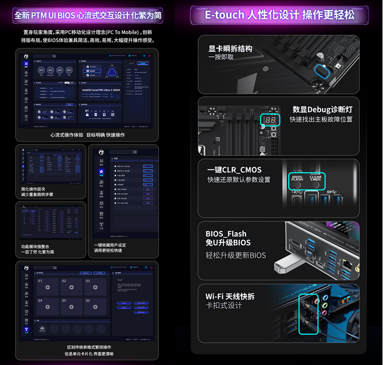 主板貼心的設計,更是讓裝機和使用體驗直接拉滿。全新升級的PTM UI BIOS,借鑒手機 APP 的交互邏輯,采用模塊化設計,交互層級不超過 2 層,手機端風格的卡片式界面,讓復雜的 BIOS 設置變得簡單易懂,即使是新手玩家也能輕松上手。顯卡瞬拆結構一按即取,不用費力擰螺絲;分布式 Debug 診斷燈能快速定位故障,小白也能輕松排查問題;CLR_CMOS 快捷按鈕、BIOS_Flash 免 U 升級、Wi-Fi 天線快拆等設計,全程省心省力。