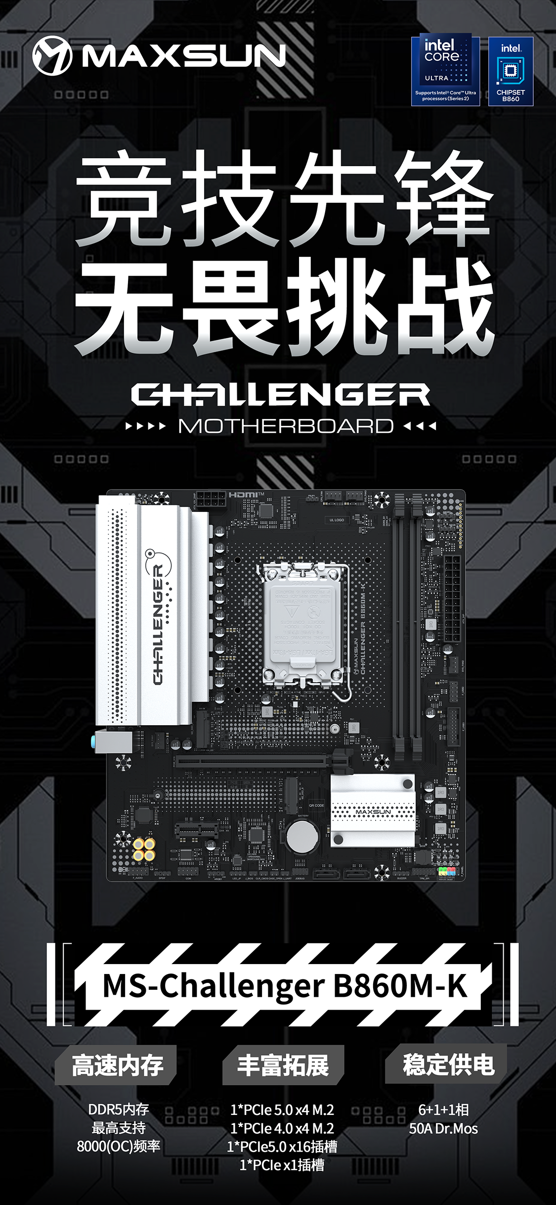 MS-Challenger B860M-K 則為入門用戶帶來高性價比之選,提供6+1+1相50A Dr.Mos穩(wěn)定供電,2*M.2滿速接口,2*PCIe拓展插槽以及多達(dá)10個USB口,其中包括6個USB 5G接口,功能齊全實用,日常辦公與輕度電競都能輕松應(yīng)對。